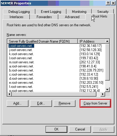 This will cause some issues, depending on your configuration. To resolve the problem, you need to get a list of root DNS servers and add each server as a root hint. A daunting task, considering there are more than a dozen of these, and the Microsoft interface doesn’t really allow for bulk copy and paste!