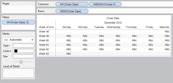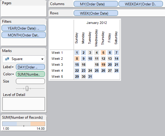 On the walls, in our emails, or on our desks, the calendar is everywhere. We use calendars to book events or meetings, remember birthdays, verify bandwidth for client coverage, etc… Making something that looks like a calendar in Tableau is as simple as putting the right pieces on the correct shelves.