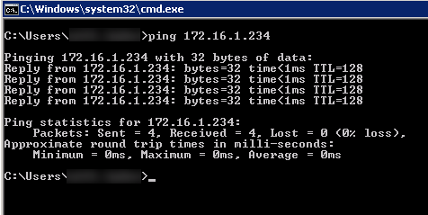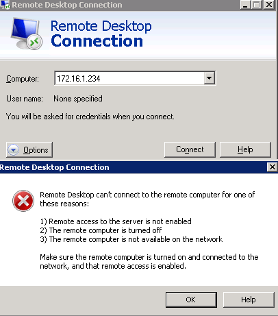 In the example listed below, I am trying to access 172.16.1.234. When trying to enable a remote desktop connection to the machine, I receive an error message. My first instinct is that the machine may be powered off, so I do a quick ping check to see if the network I am on is able to see the machine.