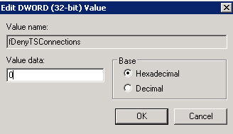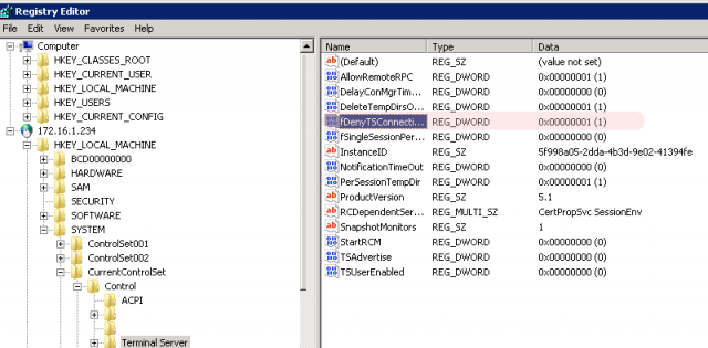 On the right hand side, find the fDenyTSConnections. The default value is set to 1. This means that remote desktop access is not available.