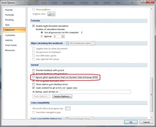 - Under the general options uncheck the box “Ignore other application that use Dynamic Data Exchange (DDE)”