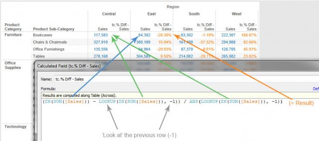 In the Difference table calculation, we want to compare a value against itself in a previous (or simply, a different) partition. Notice how the second value in the calculation is wrapped in a LOOKUP() function, which “looks” at the previous partition’s value and then subtracts it from the next one, etc. The -1 declares which partition is in relation to the base of the calculation. Change the -1 to 1 or -2 to see the change in the result.