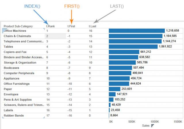 fig. 4 – Deconstructed view of INDEX(), FIRST(), and LAST() table calculation functions (running Table Down), sorted Descending by Sales.