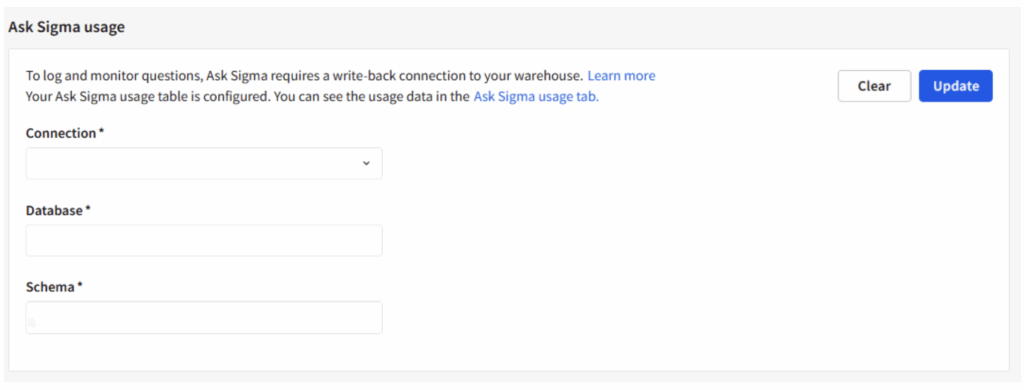 Above: The form to set up the connection to the database that will store the usage logs. Once you click “Update,” Sigma will run the appropriate script to create the necessary views.