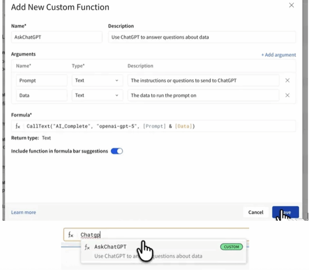 In practice, this means you can use CallText() in Sigma to call warehouse LLM functions like Snowflake’s AI_COMPLETE. Need to translate customer reviews and extract the favorite feature from each? You can do that directly from a Sigma formula. Admins can wrap these into business-friendly custom functions, so non-technical users get something like AskChatGPT() that only exposes the prompt and data fields while keeping the technical details under the hood: