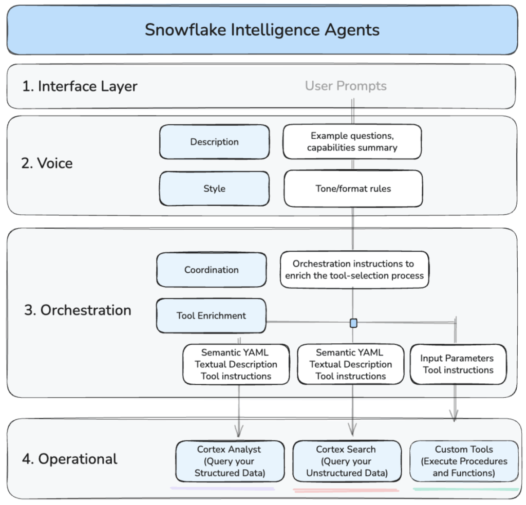 - Operational Layer: This is the actual business logic defined in Snowflake, prior to setting up the agent. This includes things like Cortex Analyst or Search capabilities, but also stored procedures or functions you have in Snowflake.