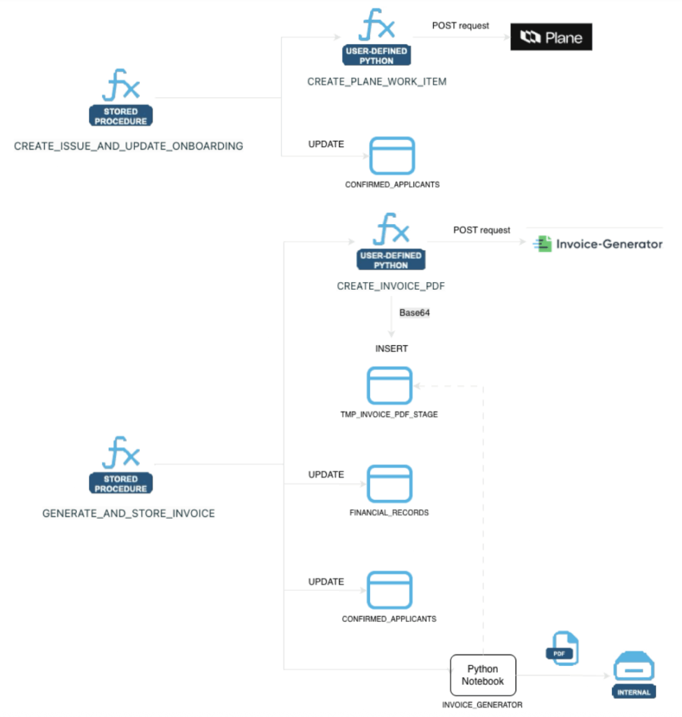 They both interact with external APIs. The former with project management tool Plane, the latter with invoice-generation API. Snowflake can interact with APIs using External Access Integrations. You can read more about this here if you are interested.