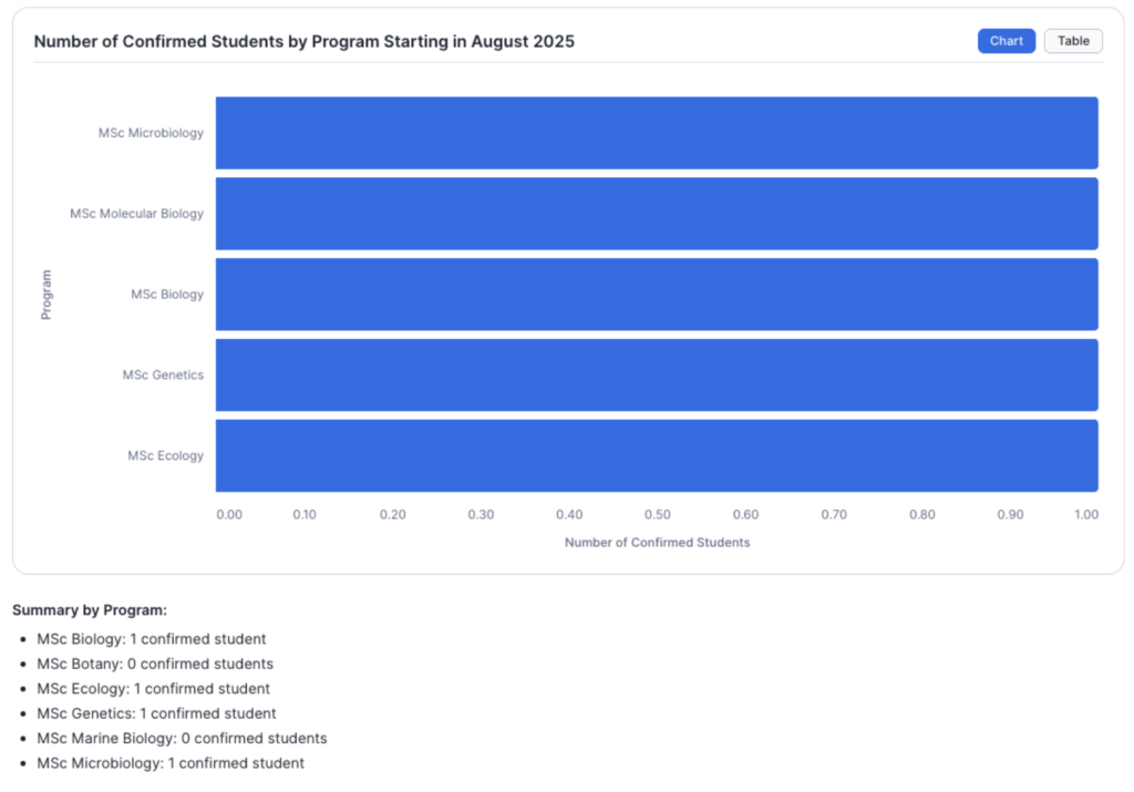 The admissions user can simply ask the agent: