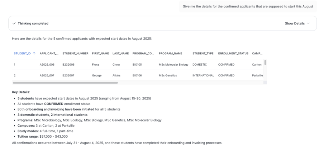 This approach demonstrates a broader shift: Moving from isolated data analytics to truly intelligent orchestration. Whether it’s admissions, finance approvals, inventory management or customer onboarding, the same structure — data logic in Snowflake, connected tools via agents — can transform repetitive processes into reliable, automated workflows.