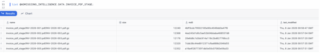 Above: PDF invoices stored in internal Snowflake stage