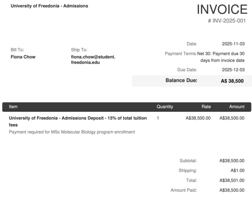 - Finance Processing: Admissions also coordinates with Finance, manually entering student details into a web-based system to generate a PDF invoice.