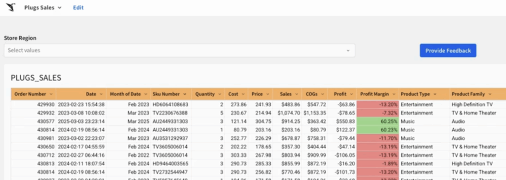 When a user submits feedback, the data writes directly to a table in the cloud data platform. No middleware, no external integrations. Sigma handles the round trip.