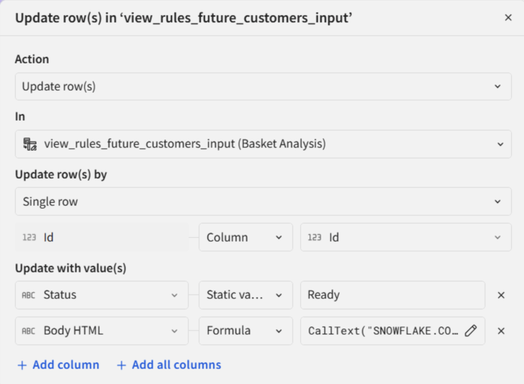 This project uses two main AI prompts, called at the row level via update actions: One to generate a marketing email in the customer’s native language, and one to convert the email body to HTML. The output quality is impressive and can be further refined through thoughtful prompt engineering.