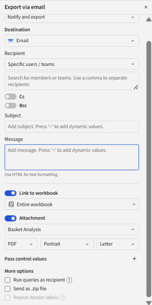Sigma currently supports seven export destinations through its built-in actions: Cloud storage, download, email, Slack, Microsoft Teams, SharePoint and Webhook. The email action is particularly feature-rich, supporting CC and BCC fields, as well as automatic inclusion of links and attachments to specific workbook pages. All fields in the interface can dynamically read values from other fields and controls within the workbook, enabling fully automated, context-aware outreach.