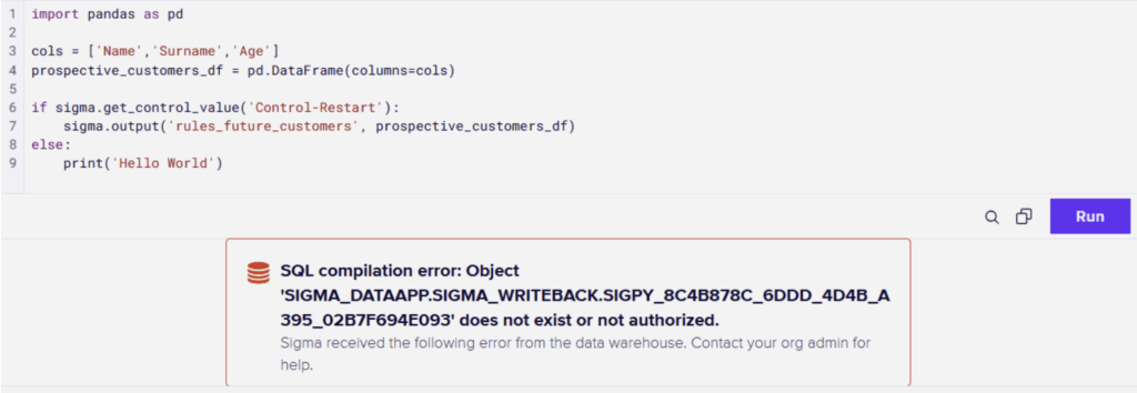 Second, all data outputs using sigma.output() must be validated and must always return a value. When working with DataFrames specifically, any downstream object referencing the returned content will fail if no table-like variable is returned. A common mistake is assuming that child tables retain their content when the parent Python code produces no output, they do not. A simple validation pattern that returns an empty DataFrame with the correct column structure is strongly recommended to avoid this issue.