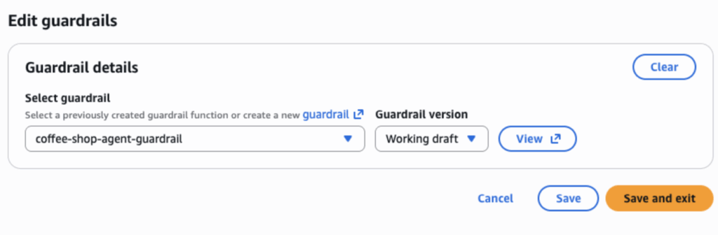 In this case, we’ve denied discussion of other customers’ information and — just for fun — weather-related topics. Once the guardrail is created, we return to the coffee shop Agent Builder, scroll to the guardrail section and attach our newly created guardrail.