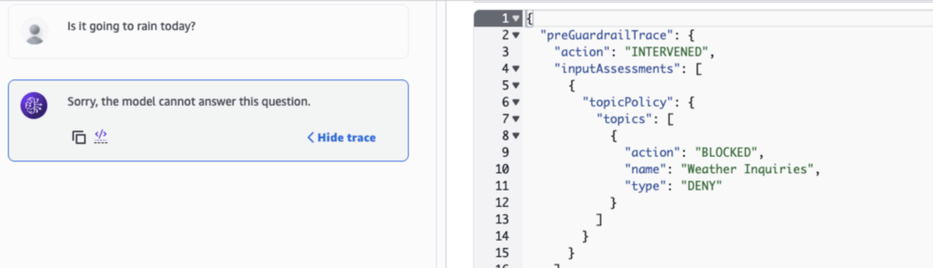 After saving agent’s updated configuration, we try asking the agent about the weather. The agent replies that it cannot provide an answer; meanwhile, the request trace (right image) reveals that our guardrail blocked the question based on the denied topics:
