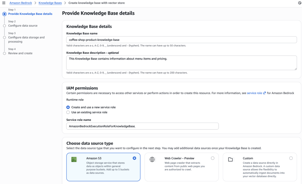 For the coffee shop example, we uploaded a PDF with menu details and item descriptions to an S3 bucket. We select that bucket as the data source when setting up the Knowledge Base. As with the agent itself, Bedrock creates a default IAM role for the Knowledge Base, granting it permission to access the S3 bucket.