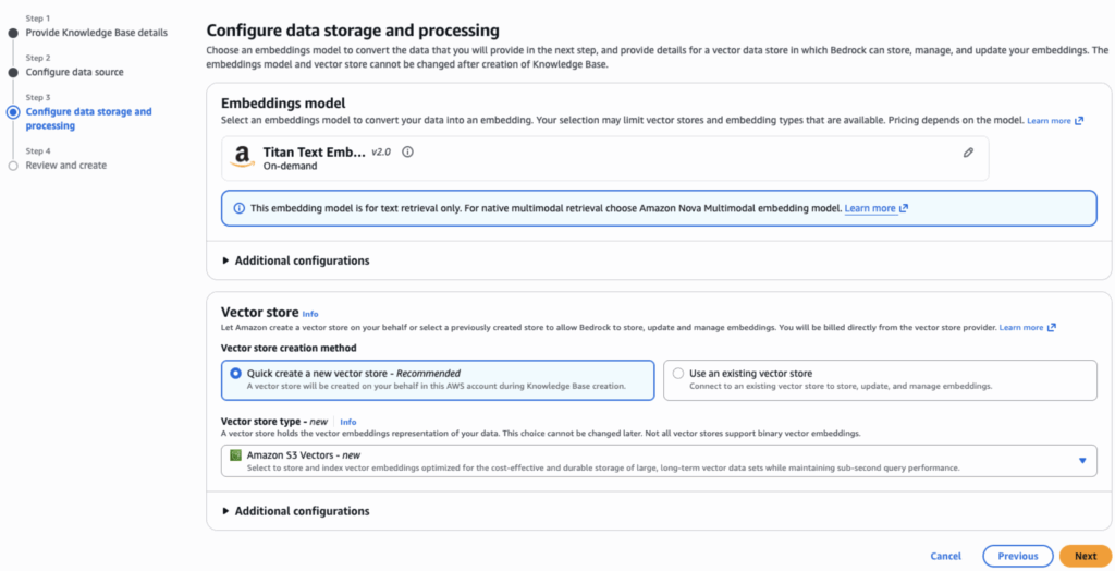 Next, we specify an embeddings model (Titan Text Embedding V2) that will convert the S3 data chunks into vector representations and a vector store to hold the embeddings. There are a few options for the vector store such as Amazon OpenSearch Service or Amazon Aurora, but we’ll choose Amazon S3 Vectors for this example. S3 Vectors is a newer option that stores the vectors in a dedicated S3 vector bucket.
