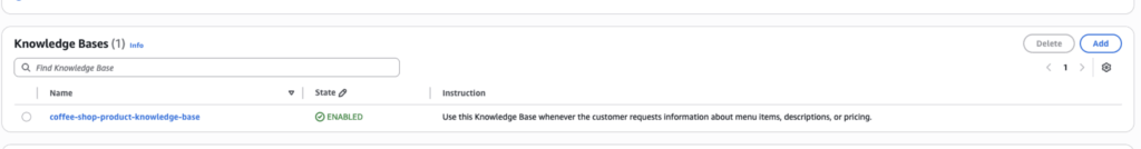 After the Knowledge Base has been created, we head back to the Agent Builder for the coffee-shop agent and scroll to the Knowledge Bases section. Here, we add the Knowledge Base that was just created to the agent’s configuration and add instructions on when/how it should be used: