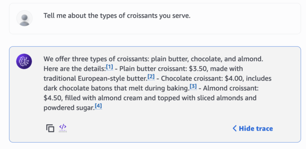 When asked about menu details from our original menu document, the agent correctly references relevant chunks in the Knowledge Base and incorporates that information into its output.