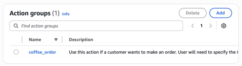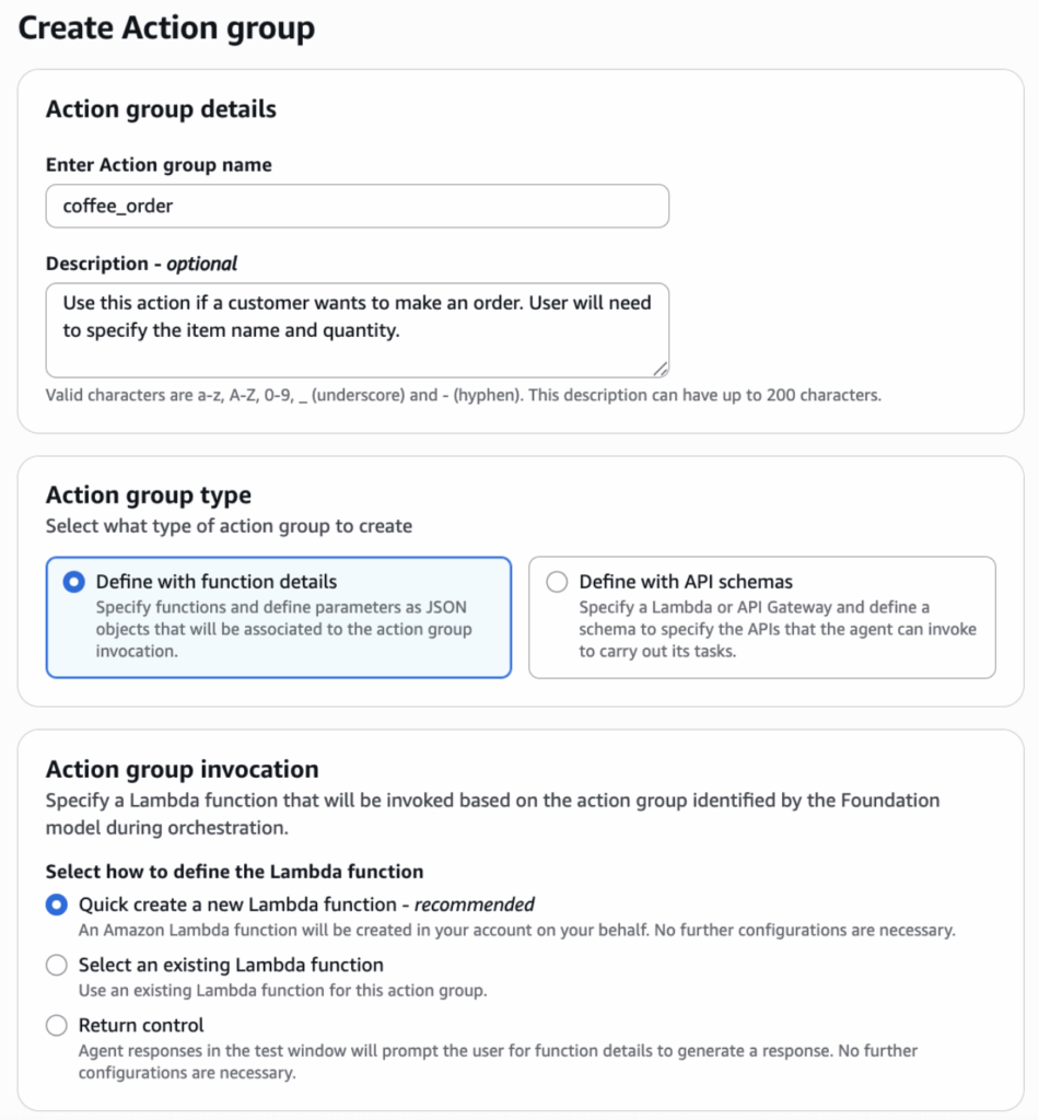 - Action Group, a set of functions, including a Lambda function to process coffee orders