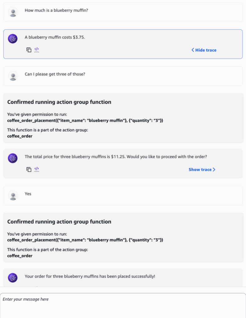 In the chat above, we see that that the agent successfully invoked the action group, correctly parsing the item name and quantity parameters. It then confirmed the order with the user before proceeding. On the backend, this triggered the Lambda function to actually process the order. Although the coffee shop agent is a simple example, it shows how quickly agents can be set up in AWS and how they interact with other AWS services to support custom use cases.