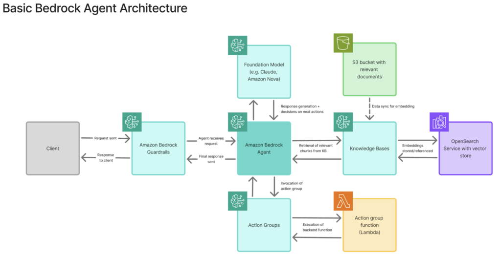 Lastly, Action Groups connect agents to backend systems and let them execute business logic using Lambda functions when invoked. Each action group includes an API schema that defines function purpose and input parameters, used by the agent to understand available capabilities. When the agent determines an action is needed, it calls the Lambda function with the structured parameters.