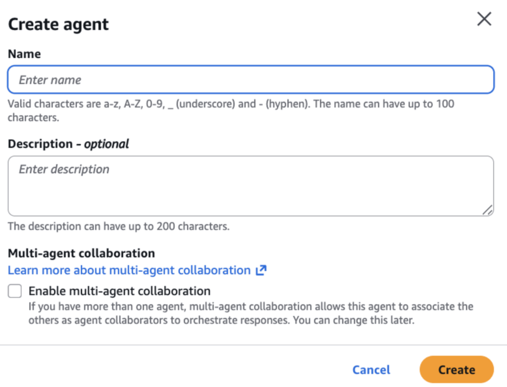 To begin building our coffee shop agent, navigate to the Amazon Bedrock service and select “Agents” from the navigation and then “Create new agent” which will prompt for a name and description for the agent. Selecting “Create” will open the Agent Builder where one can continue configuring the agent’s behavior, tools and data sources: