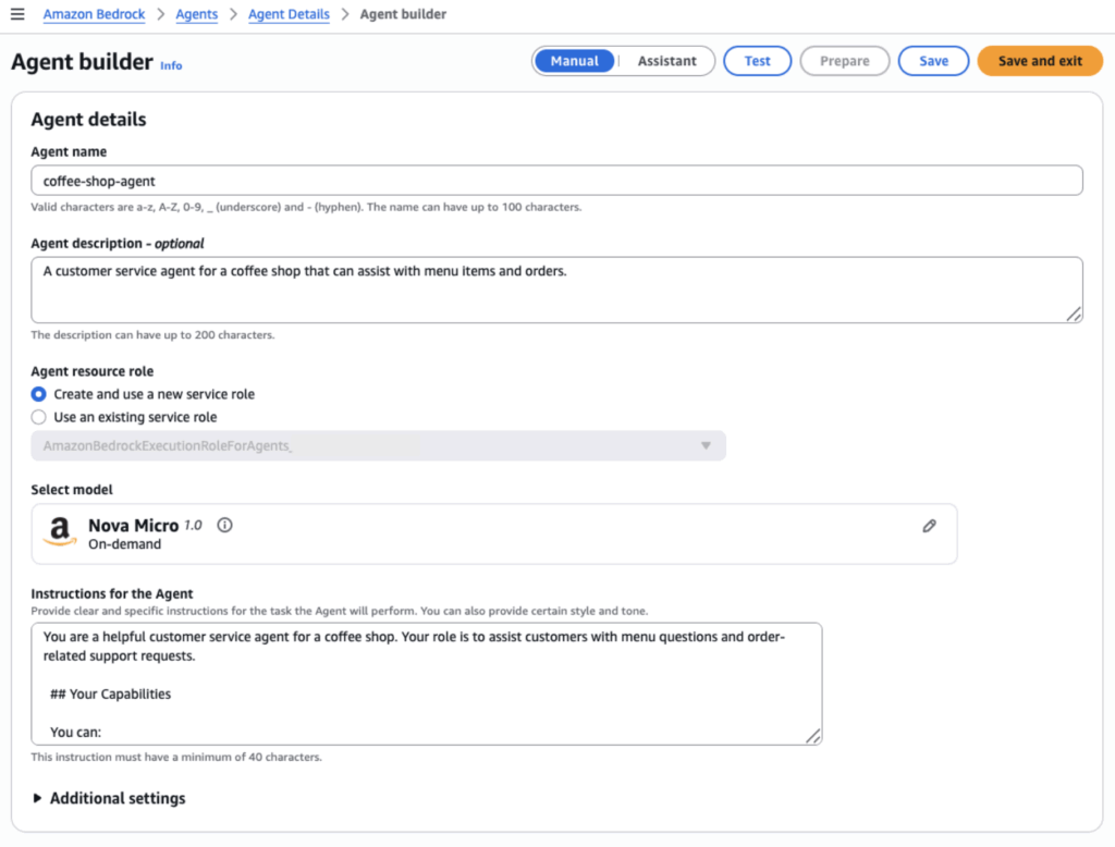 In the Agent Builder, we select the Foundation Model that the agent will rely on as its “brain,” responsible for reasoning, decision-making and response generation. In our case, we’ll stick to Amazon’s own Nova Micro for testing, a smaller model that is well-suited for testing and cost-conscious experimentation.