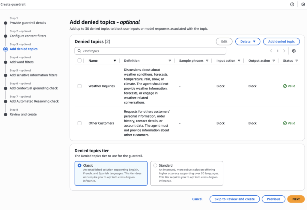 Before assigning guardrails to our coffee shop agent, we need to create them via the “Guardrails” section in the Bedrock navigation first. The “Create guardrail” steps walk through each of the protective mechanisms outlined above. For example, we can add entries to the denied topics as follows: