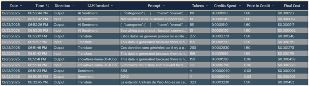 We logged each operation into a table to track token costs. After all, LLMs bill for both the input and the output (surprise!). Once there, we used the SNOWFLAKE.CORTEX.COUNT_TOKENS function in the “Tokens” calculated field to estimate token usage.