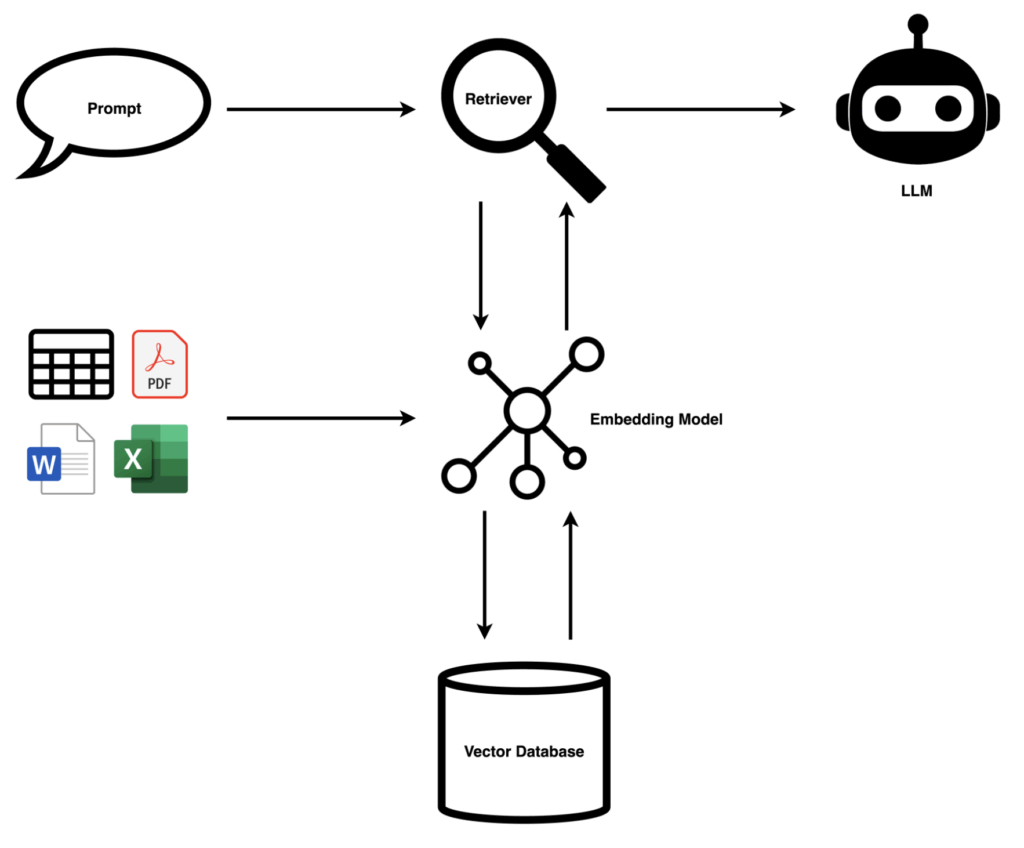 - Your documents are chunked into digestible pieces and passed through an embedding model, which converts text into numerical representations (vectors) stored in a vector database.