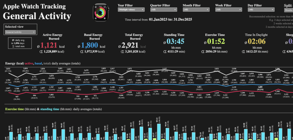- Apple Exercise Time, Activity Time, Standing Time — summed in minutes, then formatted in hh:mm for readability. Daily averages divide the total by days in the filter.