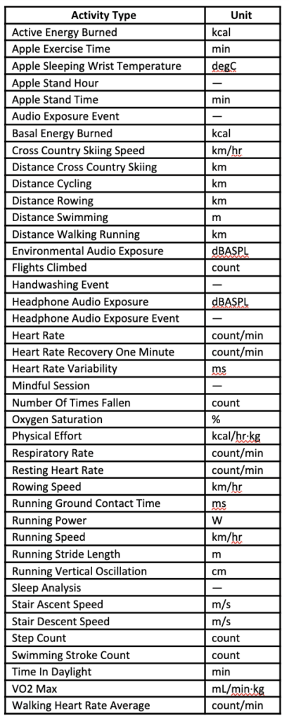 - Avg. Daily Running Time, Sleeping Time, Step Count, Time in Daylight — daily-average versions for all the above.