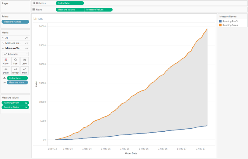 We are halfway done at this stage, however, we still don’t have the original lines showing the running totals; we only have the shaded delta between. The simplest way to add these in at this stage is to add new calculated fields called Sales and Profit, each with the value 0. Ordering your Measure Values will put these 0 lines in between the other areas, creating a line.