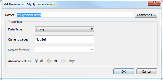 On the Tableau Desktop side, setup couldn’t be easier. Simply make a parameter of “string” type and use it in the areas where you would like to use the dynamic parameter’s values. For the end user to select, instead of the parameter, use your dynamic field as a “single value” quick filter. The parameter’s default value can be whatever you like (usually All or similar to match the quick filter).