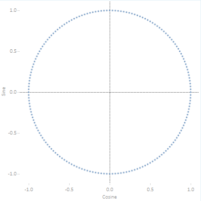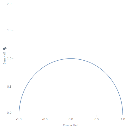 While this example gets us a full circle, what we are really going for in our graph is a semi-circle. Our original query utilized the full sine and cosine wave, but for a semi-circle we only need half of it. Luckily, a quick modification to our calculation allows us to use only half of the circle: