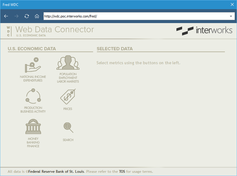 In the URL box, type http://wdc.poc.interworks.com/. On this page, select the WDC system you’d like to use; in this case, U.S. Economic Data.