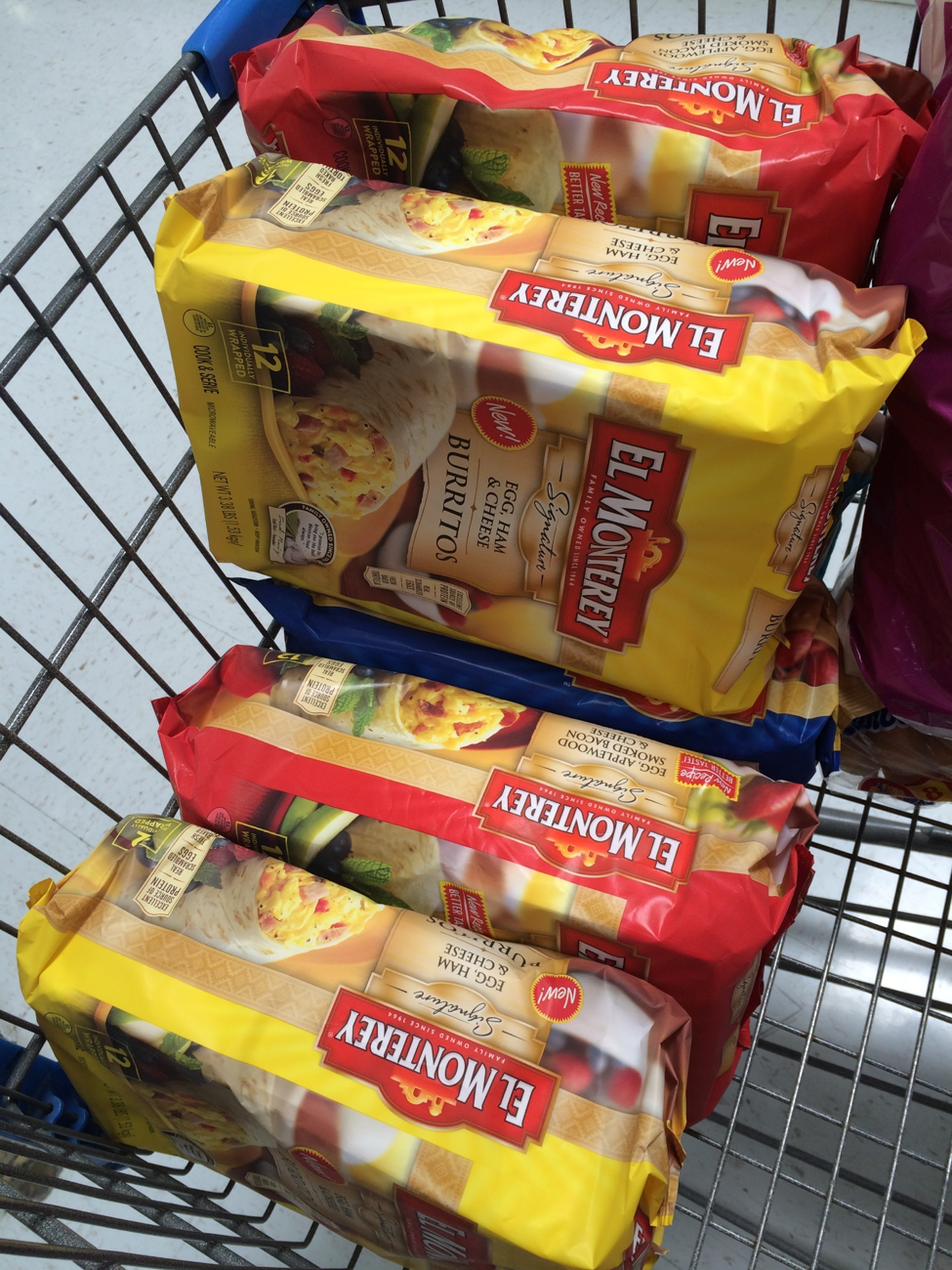 - Buy frozen breakfast burritos. Make sure there are at least 2 for each person, and then buy ANOTHER bag. Put them on the grill each morning and watch as smiling, satisfied riders roll out of camp.