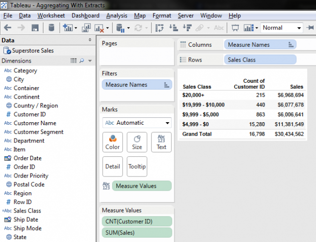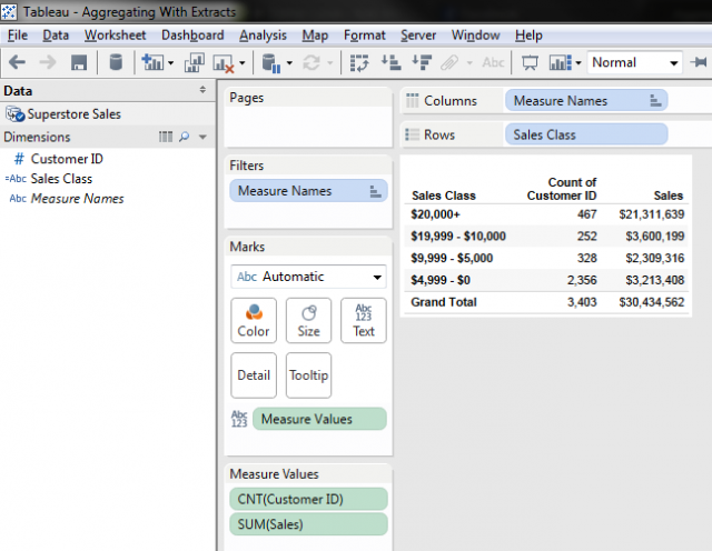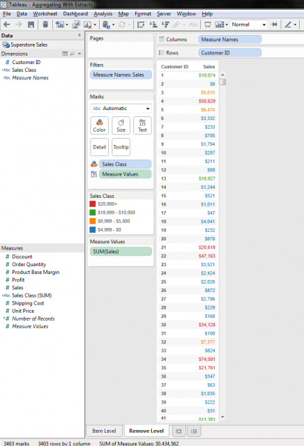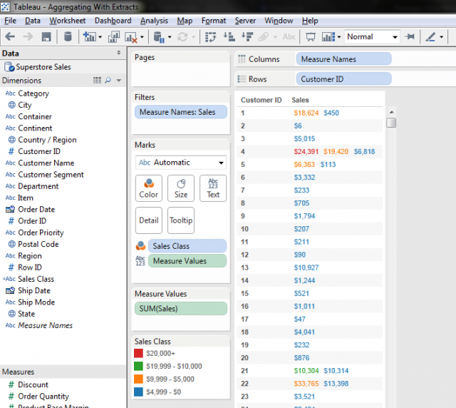 Thankfully, and unfortunately in this case, Tableau is still properly applying our row level calculation according to each item every customer has purchased. So, why is there only two entries, and why is one entry over $18k and colored orange according to the $9,999 – $5,000 range? If you look carefully at the previous screen shot, Tableau has summed up all like classifications. We had three items for Customer #1, each item in the $9,999 – $5,000 range, totaling $18,624. The rest were all items at or below the $4,999 threshold. Not exactly the result we intended. The calculation is unable to roll up according to the Customer level. But wait…here’s the great news. We can once again utilize the power of extracts to help for this scenario!