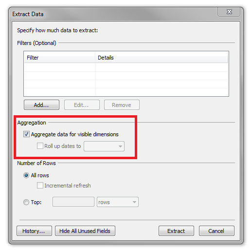 From this point, we can create our Extract, making sure to “Aggregate data for visible dimensions.”