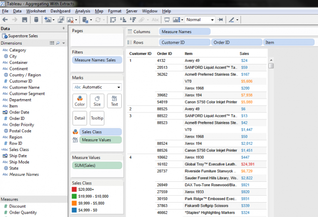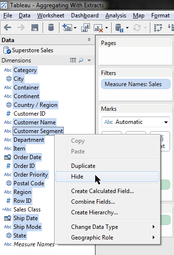 In order to fix this, we can create an extract and aggregate the data according to the level that we’re interested in (I hope now you’re now saying to yourself, “So that’s what that check box is for”). First, we simply hide all of the levels of detail that will interfere, or be of finer grain, than the level we are interested in, which happens to be Customer ID. Therefore, if we hide the Item and Order ID, Tableau will aggregate the sales to a higher level, allowing us to see sales by customer (I am hiding all of the unnecessary dimensions for simplicity of the example).