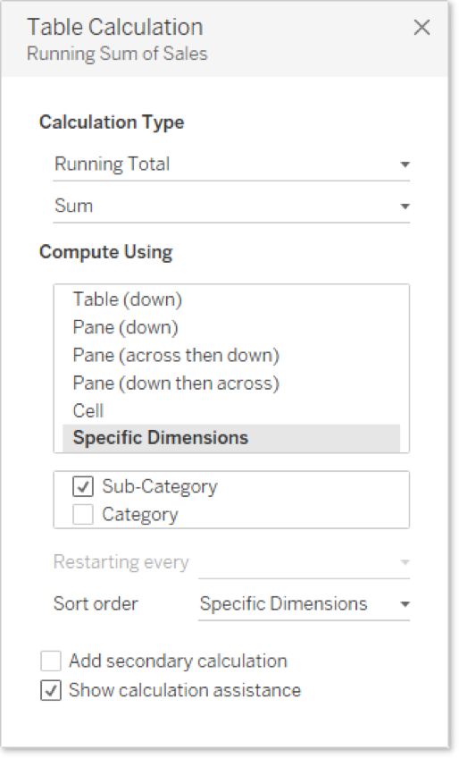 Custom sorts appear in the table calculation editor when the Compute Using menu is changed to specific dimensions. Custom sorting is available on all types of calculations except rank and percentile. In example two, I used specific dimensions. Tableau used a default sort order to organize this computation. It started the running sum at the top and continued down each sub-category until we hit a new category.