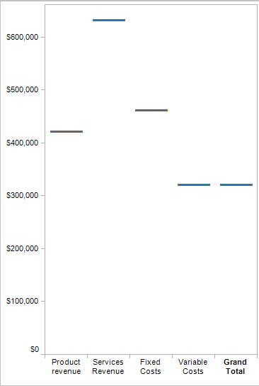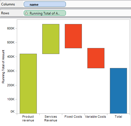 To recreate in Tableau will involve a little bit of work. There’s no way to make the standard bar chart “float”, but luckily the Gantt is here to save the day! First, pull the revenue/expense measure onto the row shelf and the revenue/expense type dimension onto the column shelf. Use a quick table calculation to create a running total across the chart. You should end up with a worksheet that looks something like this: