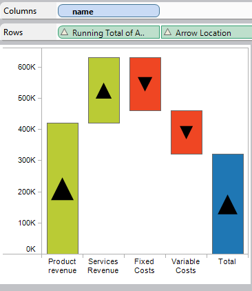 Pull this next to your Running Sum calculation and set to Dual Axis with Multiple Marks. The marks for the Arrow Location axis should be set to shape. To control the shape, reate an “Arrow Direction” calculation: