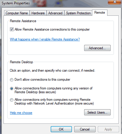 - Allow connections only from computers running Remote Desktop with Network Level Authentication (more secure). Use this if you are using something from one of the newer platforms such as Windows 7.