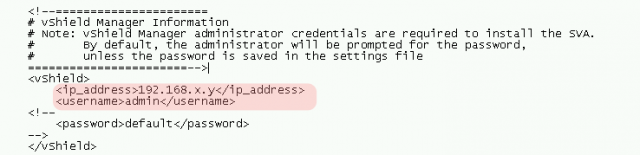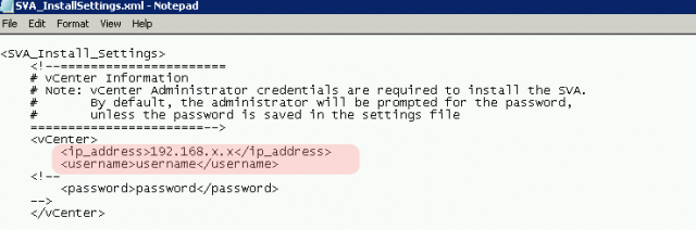 Next, modify the SVA_InstallSettings.xml file. Since you will need to deploy an SVA for every ESX/ESXi host, I recommend making an individual SVA_InstallSettings file for each host to avoid conflicts with the hostname or static IP settings.