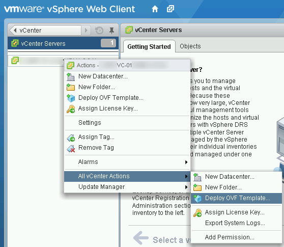 Right-click on the vCenter server, highlight All vCenter Actions and click on Deploy OVF Template.