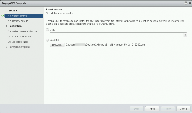 The next window will prompt you to select your OVA file. In my case, I have already downloaded theVMware vShield Manager 5.5.2 Build 1912200 OVA and have selected the local file on my machine.